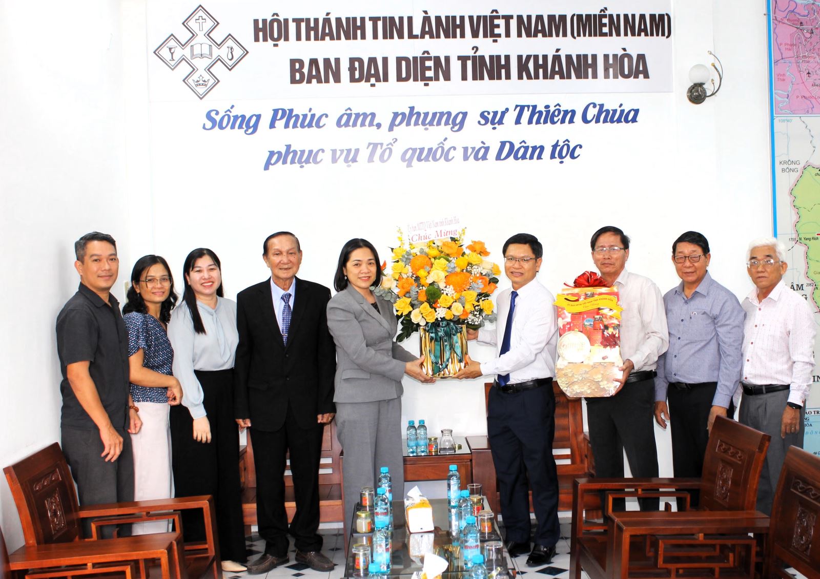 Phó Chủ tịch Thường trực Ủy ban MTTQ Việt Nam tỉnh Trần Thu Mai tặng hoa chúc mừng Ban Đại diện Hội thánh Tin lành Việt Nam (miền Nam) tỉnh Khánh Hòa