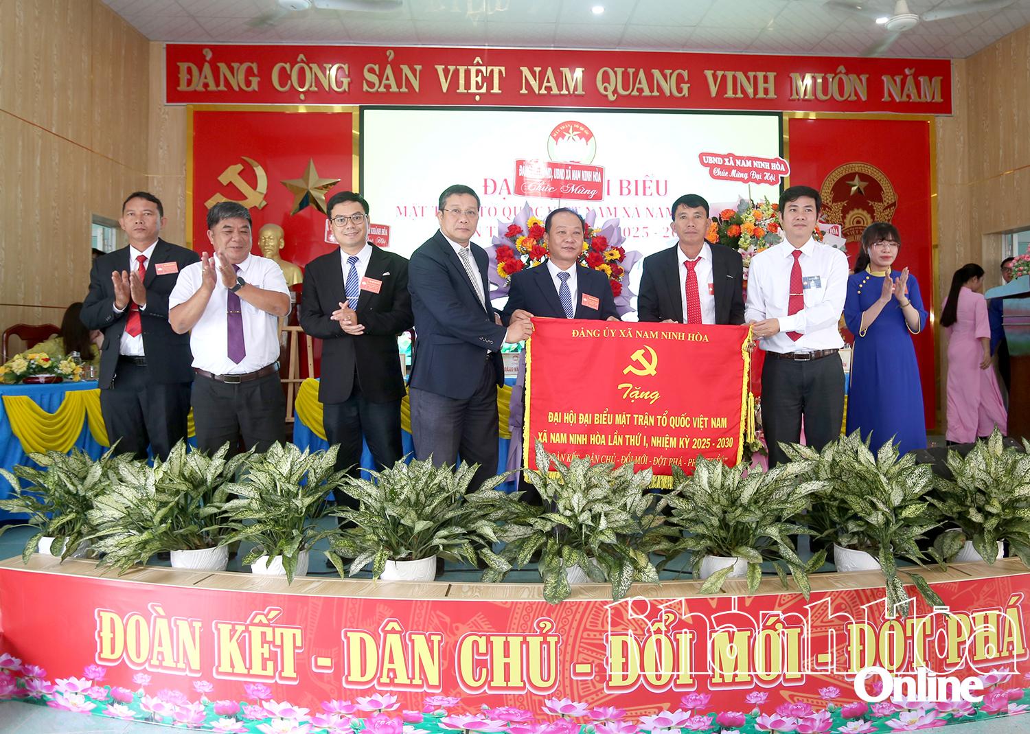 | Lãnh đạo Đảng ủy, UBND xã Nam Ninh Hòa tặng bức trướng chúc mừng đại hội. |