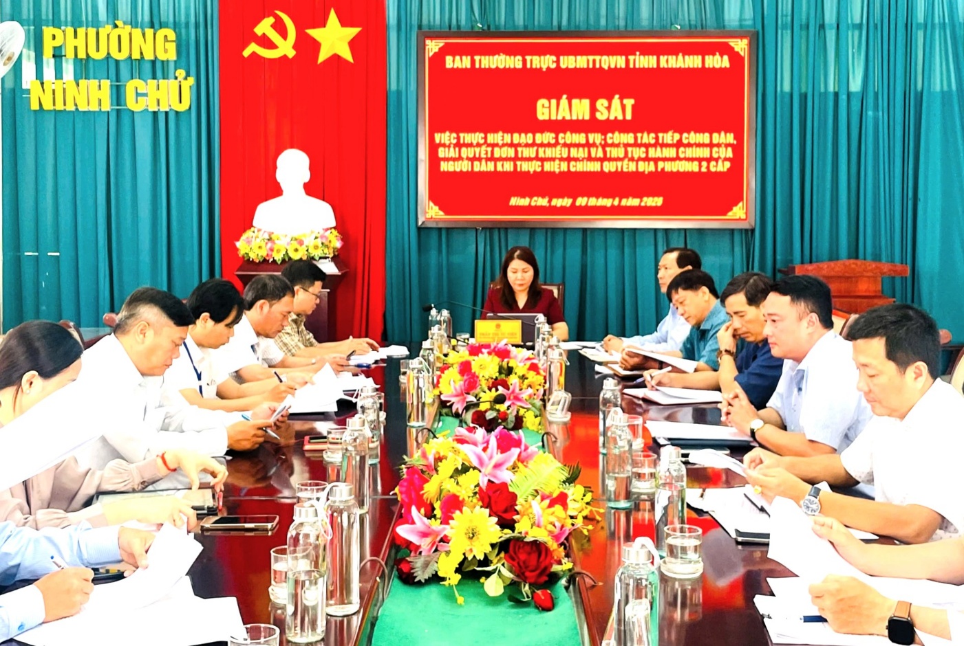 Ngày 09/4/2026, Đoàn giám sát của Ủy ban MTTQ Việt Nam tỉnh Khánh Hòa do Phó Chủ tịch Ủy ban MTTQ Việt Nam tỉnh Trần Thị Tú Viên làm Trưởng đoàn đã tổ chức giám sát tại UBND phường Ninh Chử về thực hiện đạo đức công vụ; công tác tiếp công dân, giải quyết đơn, thư khiếu nại và thủ tục hành chính của người dân khi thực hiện chính quyền địa phương 2 cấp.