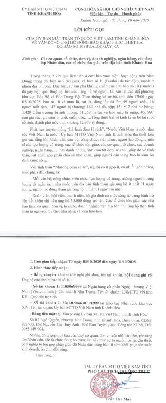 Ủy ban Mặt trận Tổ quốc Việt Nam tỉnh Khánh Hòa tha thiết kêu gọi các tầng lớp Nhân dân, cán bộ công chức, viên chức, người lao động, chiến sĩ các lực lượng vũ trang, các cơ quan, đơn vị, doanh nghiệp, ngân hàng, các tổ chức tôn giáo,.... hãy phát huy tinh thần “Lá lành đùm lá rách”, chung tay ủng hộ cả về vật chất lẫn tinh thần, giúp bà con sớm khắc phục khó khăn, ổn định cuộc sống.