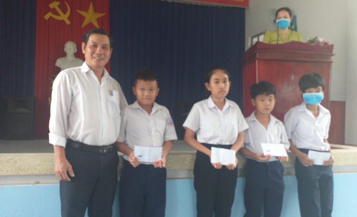 Ông Trần Văn Sỹ, Chủ tịch Ủy ban Măt trận xã trao quà cho các em học sinh nghèo