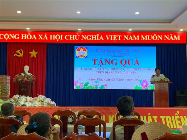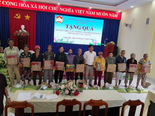 Chiều ngày 02/6/2023, tại Hội trường UBND xã Cam Tân – huyện Cam Lâm, Ủy ban MTTQ Việt Nam xã phối hợp với UBND xã Cam Tân và nhóm mạnh thường quân ở xã Cam Tân xin được dấu tên. Đến tham dự có các đồng chí là lãnh đạo Đảng ủy, UBND, UBMT và nhóm mạnh thường quân. Tổ chức gặp mặt thăm, tặng quà cho 100 hộ nghèo, cận nghèo và hộ có hoàn cảnh khó khăn trên địa bàn xã Cam Tân mỗi phần quà 300.000 đồng. tổng kinh phí là 30.000.000 đồng.