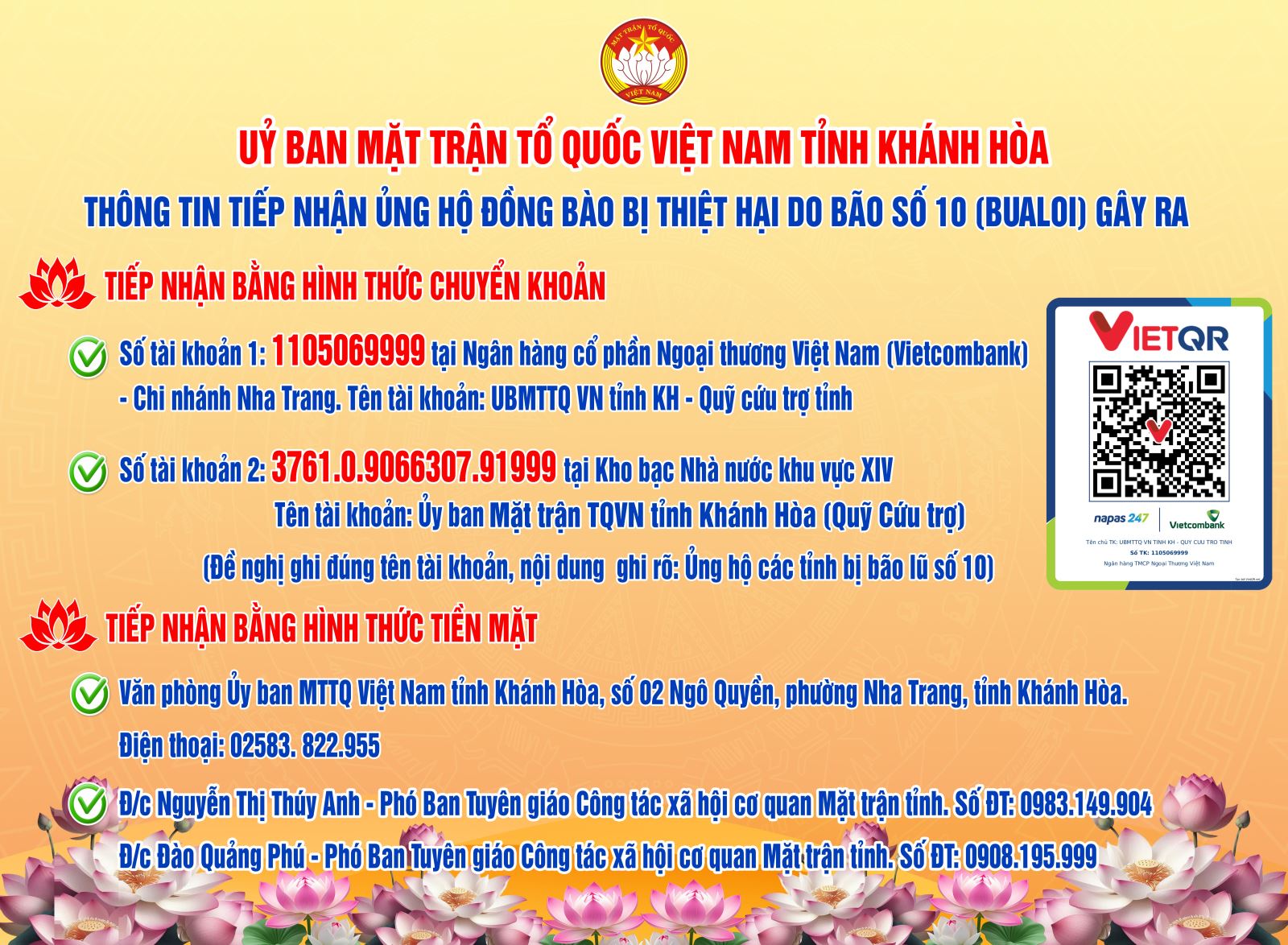 Đồng thời, ghi nhận sự chung tay đóng góp ủng hộ của các đơn vị, doanh nghiệp giúp người dân các tỉnh khắc phục thiệt hại do bão lũ gây ra. Ban Thường trực Ủy ban MTTQ Việt Nam tỉnh Khánh Hòa và Ban Vận động cứu trợ tỉnh Khánh Hòa cam kết sẽ công khai sao kê toàn bộ nội dung số tiền của các đơn vị, tổ chức, cá nhân hỗ trợ trên Trang thông tin điện tử, Fanpage Ủy ban MTTQ Việt Nam tỉnh Khánh Hòa và trên các phương tiện thông tin đại chúng của tỉnh; đồng thời sử dụng đúng mục đích và có hiệu quả nguồn kinh phí vận động ủng hộ.