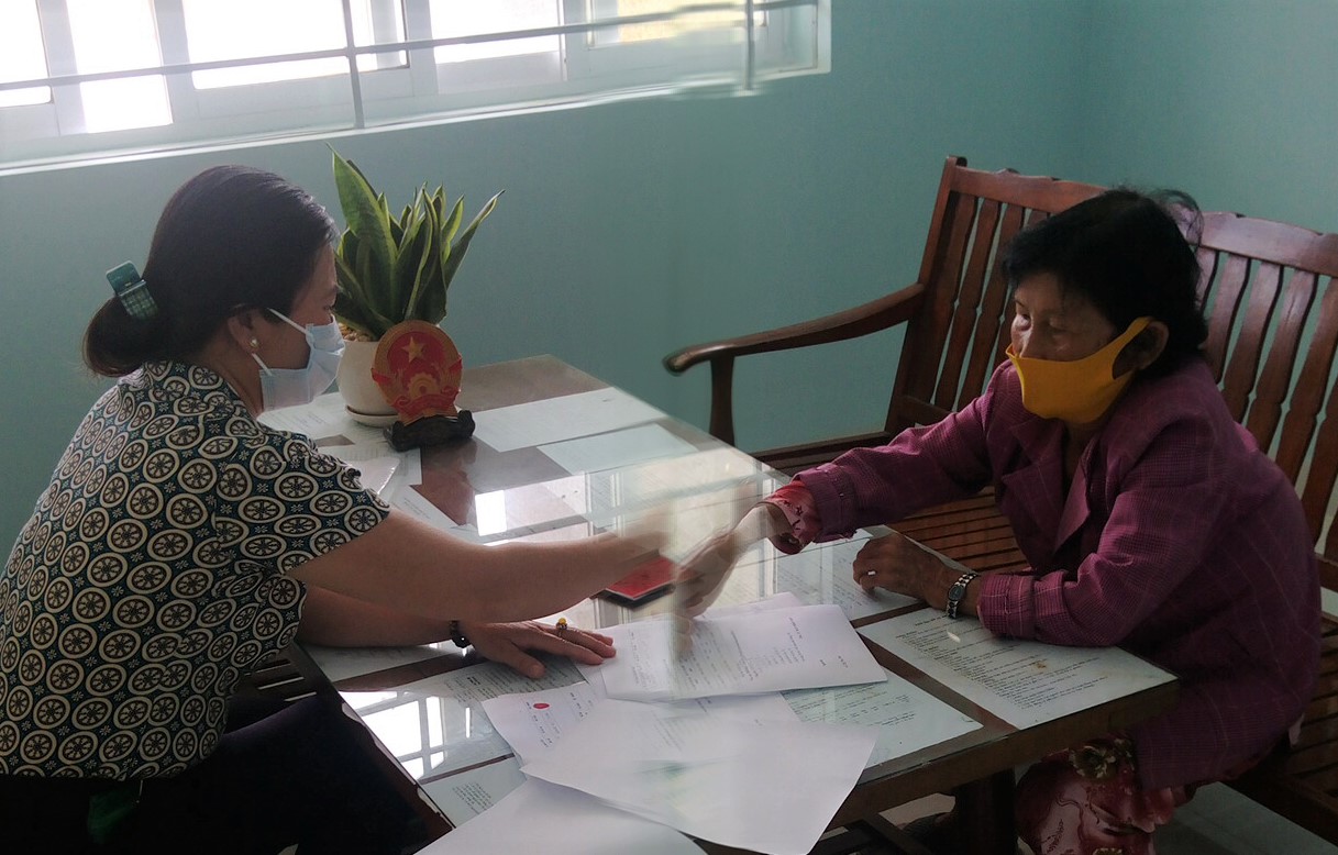 Công chức VHXH phụ trách TBXH làm thủ tục trao tiền cho hộ gia đình chính sách của xã