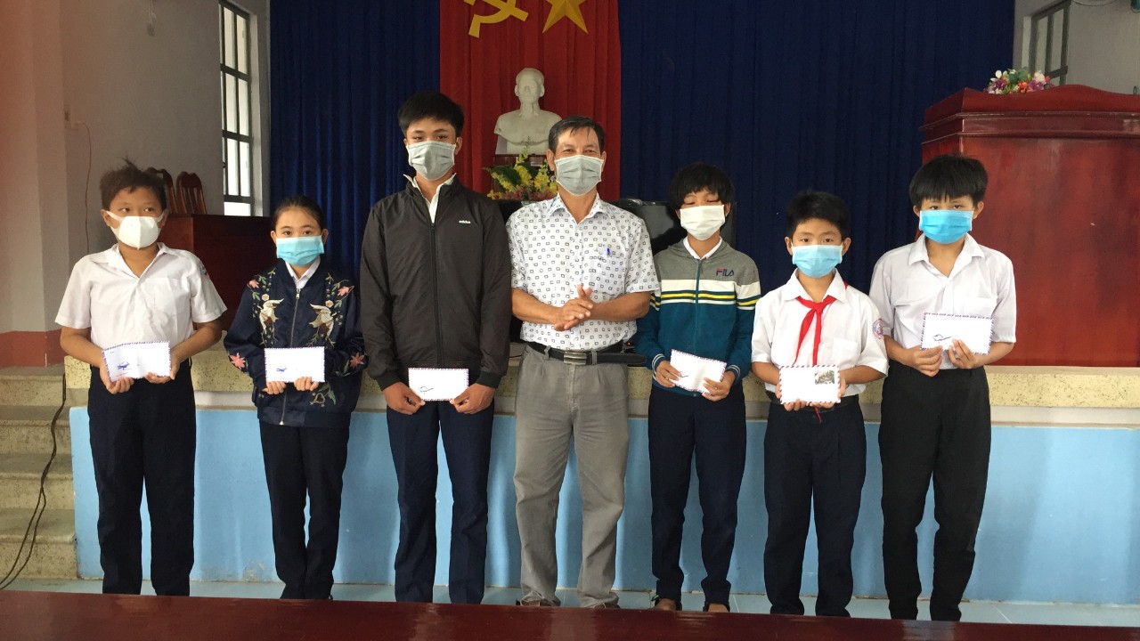 Trước đó, Mặt trận xã phối hợp với Hội Khuyến học xã đã vận động 01 mạnh thường quân hỗ trợ cho 08 em, gồm quà và tiền trị giá 200.000/em và phòng TBXH huyện tặng 1.000.000đ cho 1 em học sinh trường Trung học cơ sở Nguyễn Công Trứ mồ côi hiện ở với bà ngoại.