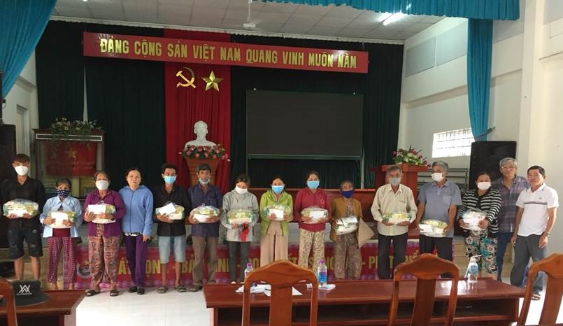 Các nhà hảo tâm và Mặt trận xã trao quà cho người dân