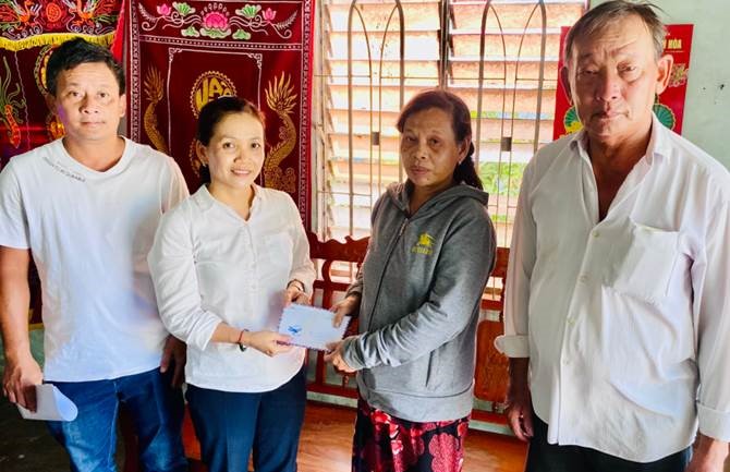 Bà Nguyễn Thị Tuyết Nga-Chủ tịch Mặt trận xã (bên trái) và Ban CTMT thôn Nam 3 trao hỗ trợ gia đình ông Nhàn