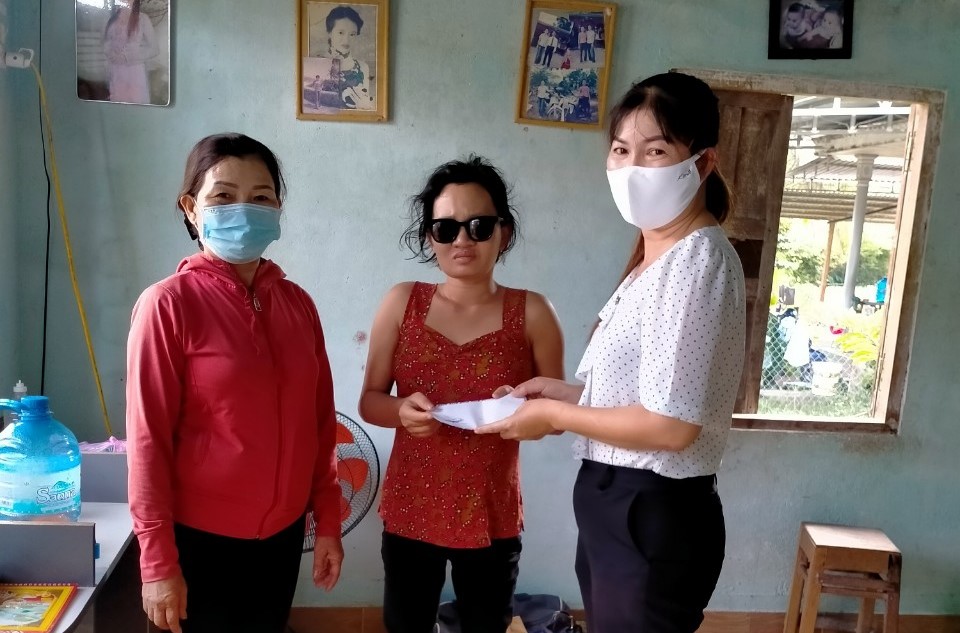 Bà Nguyễn Ngọc Bảo Uyên – Chủ tịch UBMTTQ Việt Nam xã Diên Tân (bìa phải) thăm, hỗ trợ khó khăn đột xuất cho chị Đào Thị Minh Thư