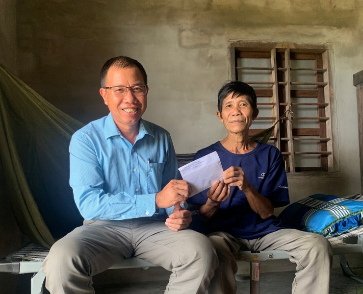 Đại diện Mặt trận xã Ninh Sim trao hỗ trợ cho ông Nguyễn Giang Thu