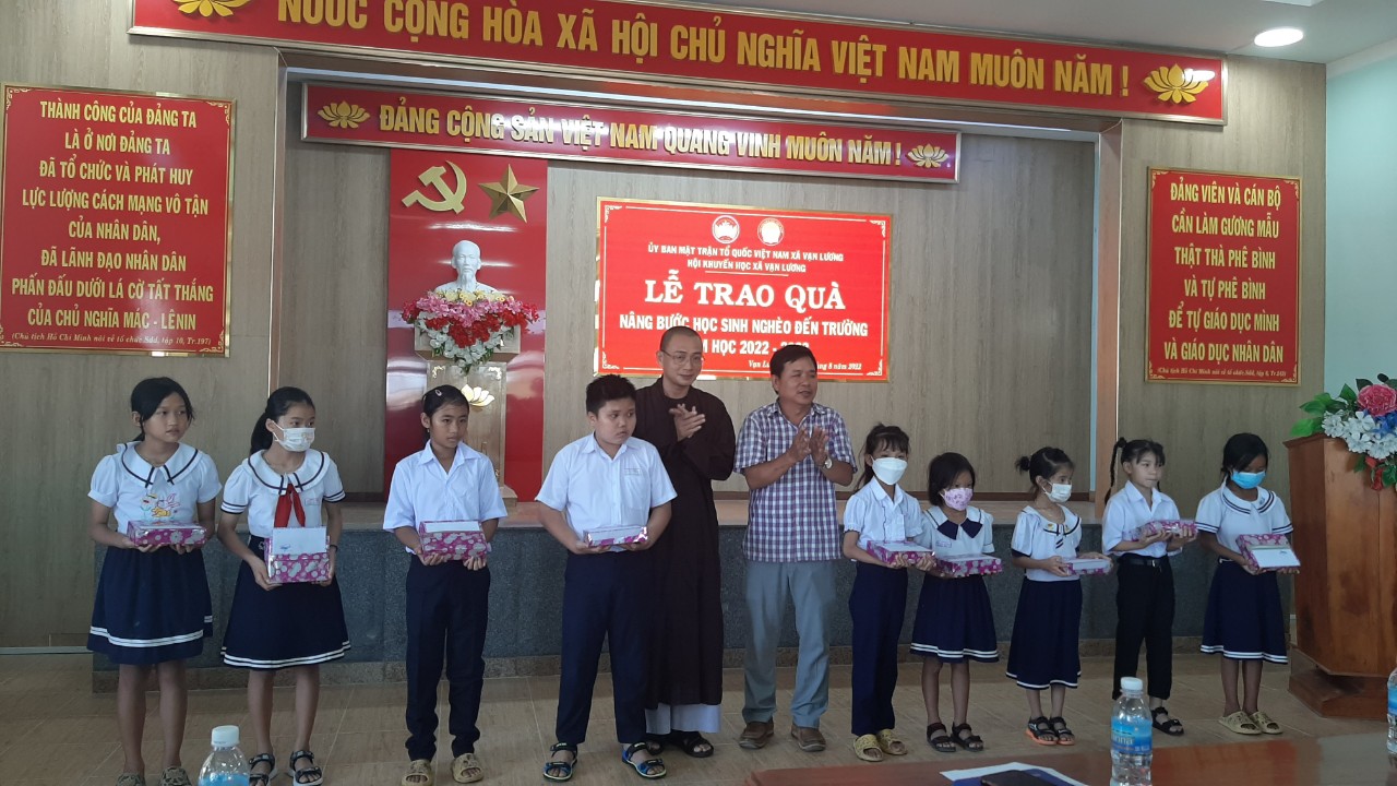 Nhằm tạo điều kiện cho học sinh thuộc hộ nghèo chuẩn bị năm học mới 2022 – 2023, chiều ngày 18 tháng 8 năm 2022, Ủy ban Mặt trận xã Vạn Lương, huyện Vạn Ninh tổ chức buổi lễ gặp mặt, trao đổi, động viên và tặng quà cho 53 em học sinh thuộc hộ nghèo trên toàn xã Vạn Lương. Mỗi suất quà bao gồm 500.000 đồng và 10 quyển vở, tổng kinh phí hỗ trợ là 29.500.000 đồng.