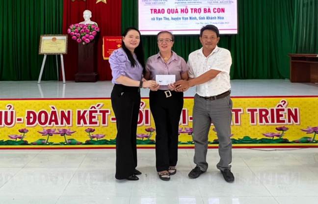 Ông Đặng Trung Phú - Chủ tịch Mặt trận xã và bà Lê Thị Kim Chung - Phó CT UBND xã tiếp nhận quỹ “Vì người nghèo” từ Đại Lý thức ăn tôm Hồng Nhận.