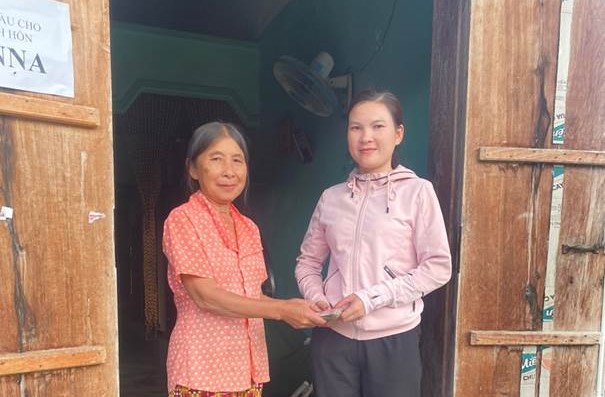 Bà Trương Thị Lanh - Phó Chủ tịch UBMTTQVN xã (bên phải) trao tiền hỗ trợ cho bà Phùng Thị Phụng