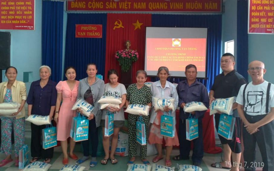 Hướng tới kỷ niệm 72 năm Ngày Thương binh Liệt sỹ (27/7/1947 - 27/7/2019) và dịp Lễ Vu Lan sắp đến, chiều 19/7/2019, Mặt trận phường Vạn Thắng, thành phố Nha Trang phối hợp cùng Hội Liệp hiệp Phụ nữ và Đoàn thanh niên phường tiếp tục thực hiện mô hình “Kết nối trái tim, yêu thương và chia sẻ”, trao quà cho gia đình chính sách khó khăn và một số hộ dân có người ốm đau, bệnh tật trên địa bàn phường.