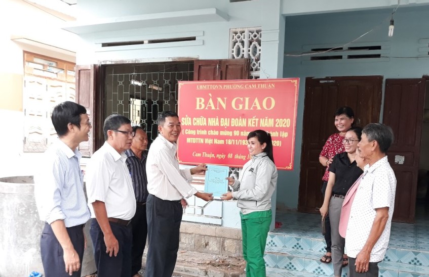 Thiết thực lập thành tích Chào mừng 90 năm Ngày thành lập Mặt trận dân tộc thống nhất Việt Nam (18/11/1930-18/11-2020), chiều 08/10/2020, UBMTTQVN phường Cam Thuận phối hợp với Ban công tác mặt trận Tổ dân phố Thuận Hưng tiến hành bàn giao Nhà Đại đoàn kết cho gia đình bà Trần Thị Lệ Trinh thuộc diện hộ cận nghèo tại địa phương.