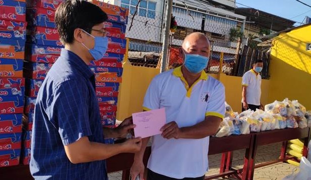 Ủy ban MTTQ thị trấn Diên Khánh tiếp nhận hỗ trợ từ đại diện Hội quán Quảng Đông (bên phải)