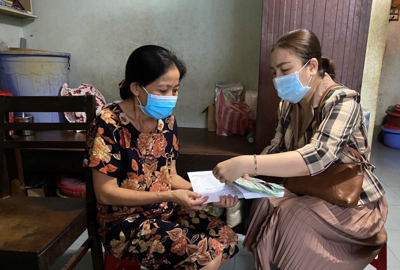 Bà Nguyễn Thị Cẩm Nhung - Chủ tịch Mặt trận phường (bên phải) trao tiền hỗ trợ cho chị Kiều