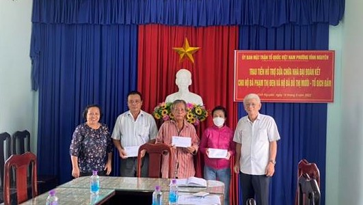 Sáng ngày 16/9/2022, Ủy ban MTTQ phường Vĩnh Nguyên (TP. Nha Trang) đã tổ chức trao tiền hỗ trợ sửa chửa nhà đại đoàn kết cho 01 hộ nghèo, 01 hộ gia đình chính sách và 2 trường hợp khám chữa bệnh có hoàn cảnh khó khăn.