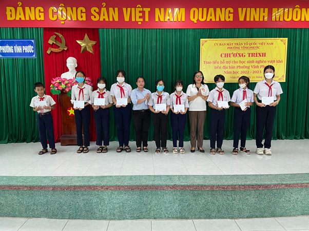 Chiều ngày 21/10/2022, Ban Thường trực Ủy ban Mặt trận phường Vĩnh Phước (TP. Nha Trang) cùng với Ban vận động Quỹ Vì người nghèo, các mạnh thường quân tổ chức trao tiền hổ trợ cho các em học sinh nghèo vượt trong năm học 2022-2023.