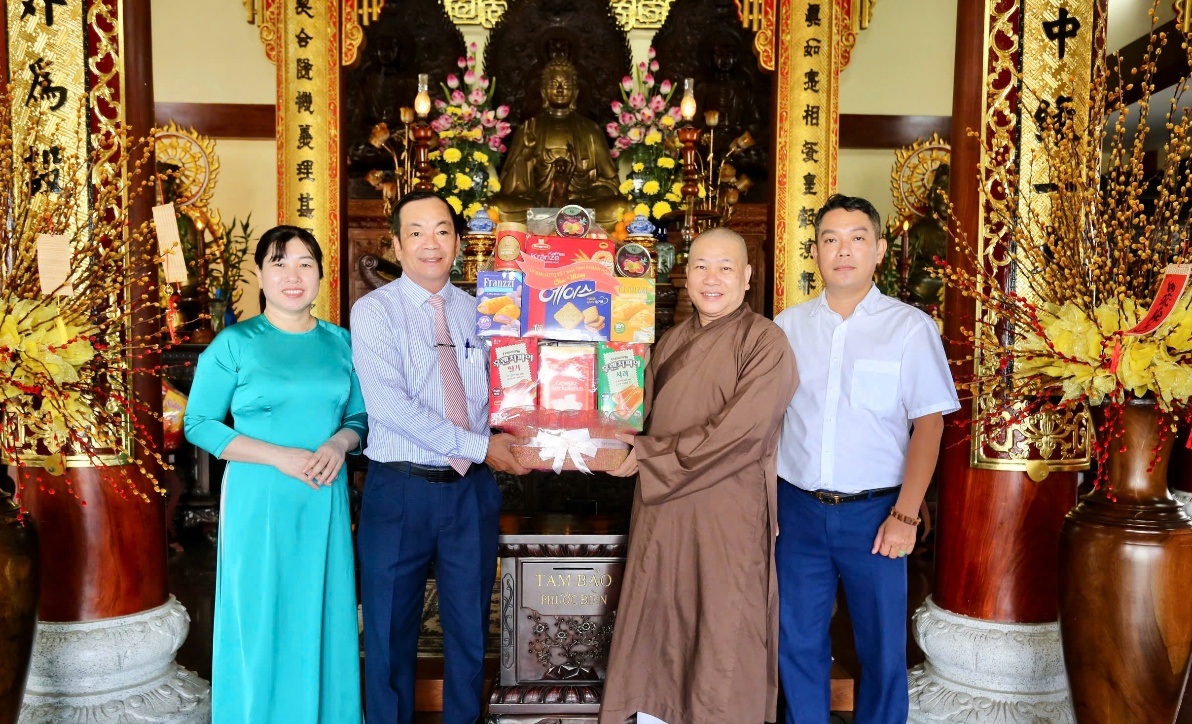 Đồng chí Nguyễn Văn Thiện thăm, tặng quà trụ trì chùa Linh Sơn.