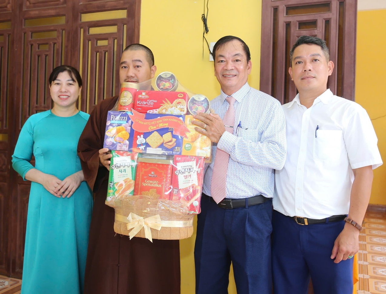 Phó Chủ tịch UBMTTQ Việt Nam tỉnh Nguyễn Văn Thiện (thứ hai, bên trái) thăm, tặng quà trụ trì chùa Vạn Đức.
