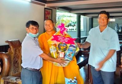 Ông Lý Nhi- Chủ tịch UBMTTQVN xã (bên phải) trao quà cho Thượng tọa Thích Tâm Hòa, tại Chùa Tân Long, xã Diên Phú, huyện Diên Khánh