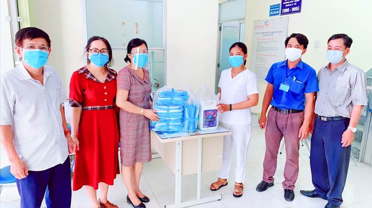 Bà Nguyễn Thị Khánh Hòa - UV BTV Thành ủy, Trưởng Ban Dân vận, Chủ tịch UBMT thành phố trao tặng vật tư y tế cho Trạm Y tế phường Vĩnh Nguyên