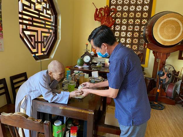 Ông Nguyễn Ngọc Ngân – trưởng đoàn công tác ân cần thăm hỏi vị chức sắc