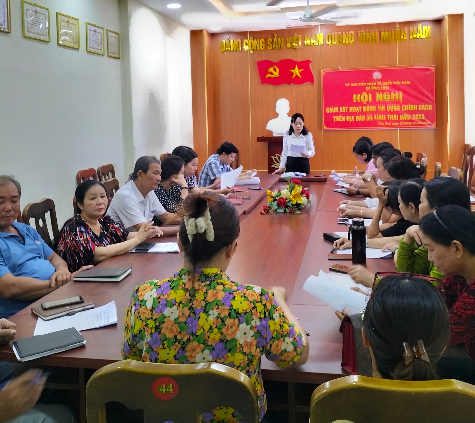 Sáng ngày 23/10/2023 Đoàn giám sát Ủy ban MTTQ xã Vĩnh Thái có buổi làm việc với UBND và các Đoàn thể xã nhận nguồn vốn ủy thác của Ngân hàng chính sách. Tham dự và chỉ đạo buổi giám sát có ông Đặng Minh Đức – Bí thư Đảng ủy – CT.HĐND xã; đoàn giám sát do bà Đinh Thị Cam - Ủy viên BTV Đảng ủy, Chủ tịch Ủy ban MTTQ Việt Nam xã làm Trường Đoàn. Làm việc với Đoàn có ông Nguyễn Trường Nhật Nguyên – PCT.UBND xã; lãnh đạo Hội Nông dân, Hội Phụ nữ, Trưởng thôn và các tổ trưởng tổ vay vốn trên địa bàn xã.