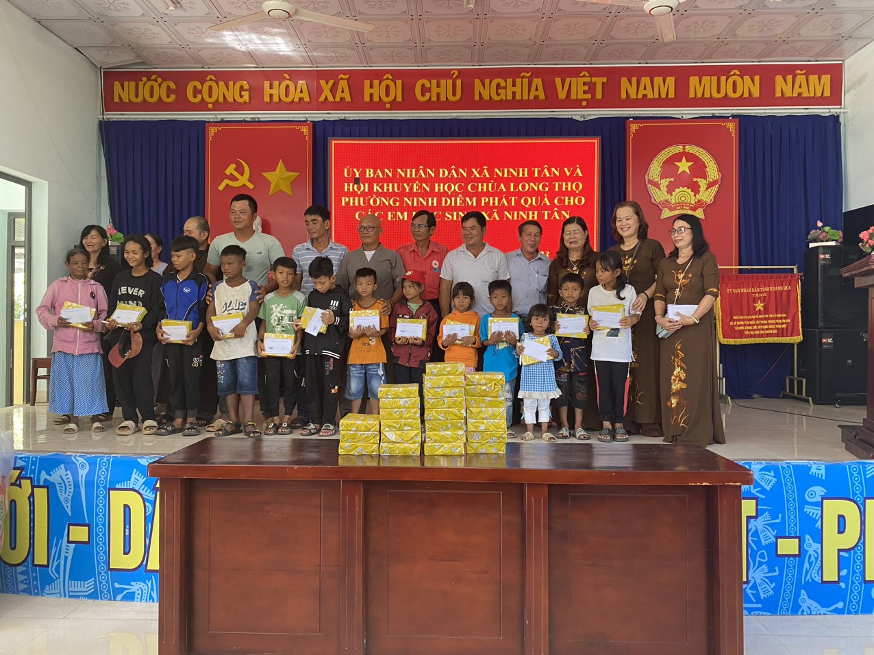 Trong không khí hân hoan chuẩn bị ngày Khai giảng năm học mới 2023 -2024 của học sinh cả nước, thực hiện Chương trình kết nối yêu thương đồng hành cùng xã hội trong công tác giáo dục, sáng 13/8/2023 Hội khuyến học Chùa Long Thọ phường Ninh Diêm thị xã Ninh Hoà phối hợp với UBND xã Ninh Tân tổ chức phát 100 xuất quà cho các em học sinh thuộc hộ khó khăn là đồng bào dân tộc thiểu số thôn Suối Sâu và các thôn trên địa bàn xã Ninh Tân, quà gồm vở và tiền mặt, mỗi xuất quà trị giá 250 ngàn đồng. Đồng thời Hội cũng đã tặng 02 xuất quà, mỗi xuất trị giá 500 ngàn đồng cho 02 hộ nghèo của địa phương là hộ ông K Phúc đồng bào dân tộc Raglai thôn Suối Sâu và hộ bà Nguyễn Thị Ánh Minh thôn Nam xã Ninh Tân. Tổng trị giá nguồn quà là 26.000.000 đồng. Món quà là nguồn động lực tinh thần để các em học sinh vươn lên trong học tập, góp phần cùng địa phương thực hiện tốt chính sách an sinh xã hội.