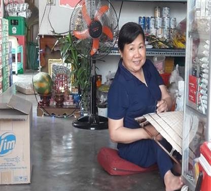 Chị Lữ Thị Xuân đang chằm nón và bán tạp hoá tại nhà