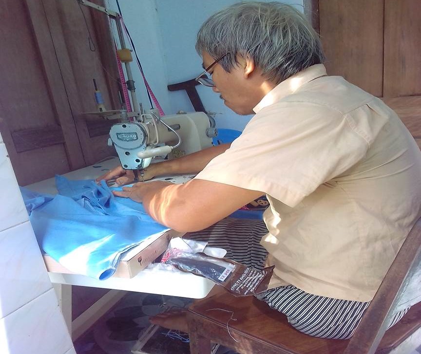 Anh Lê Thảo đang may đồ cho khách tại nhà