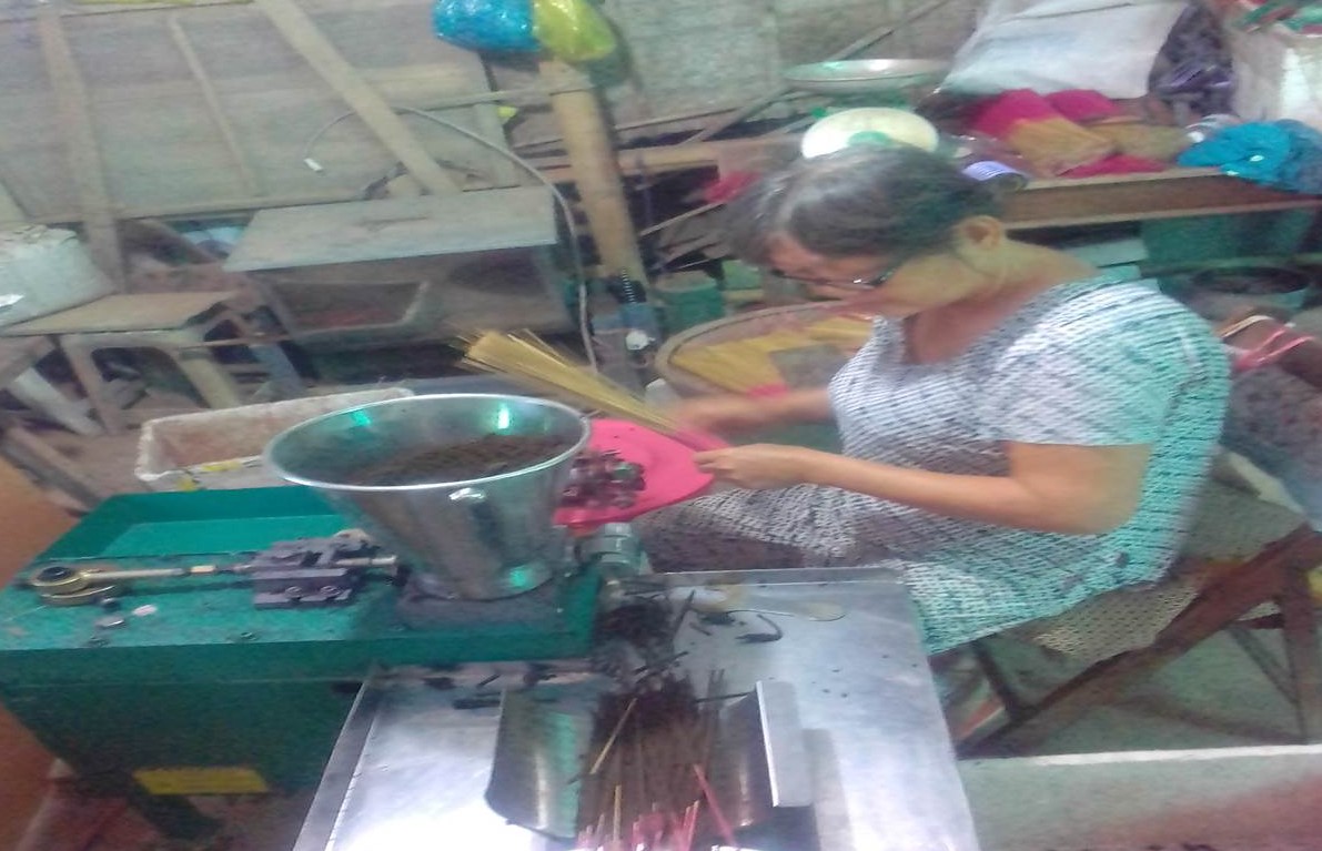 Chị Trần Thị Nhiều đang sản xuất hương bằng máy