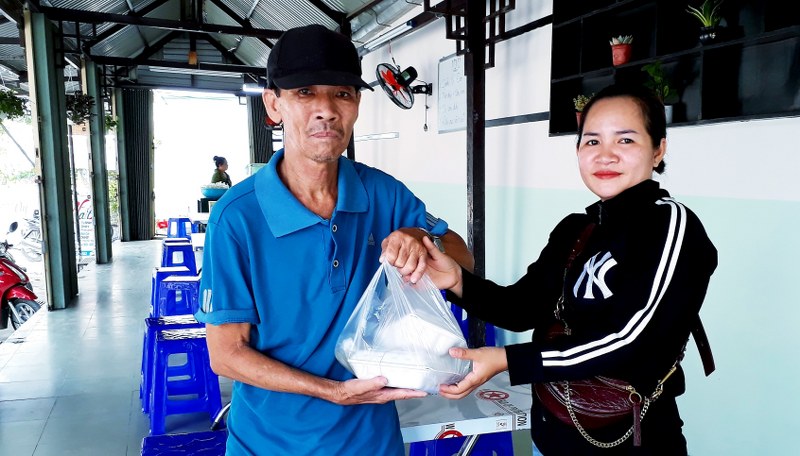 Chị Nguyễn Thị Phương Trang - Chủ quán cơm 5K (bên phải), trao suất ăn cho người có hoàn cảnh khó khăn