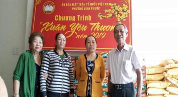 Bà Võ Thị Thanh Tuyến (thứ 3 từ trái sang) phối hợp phát quà cho các hộ nghèo, hộ khó khăn trong dịp tết Nguyên Đán năm 2019