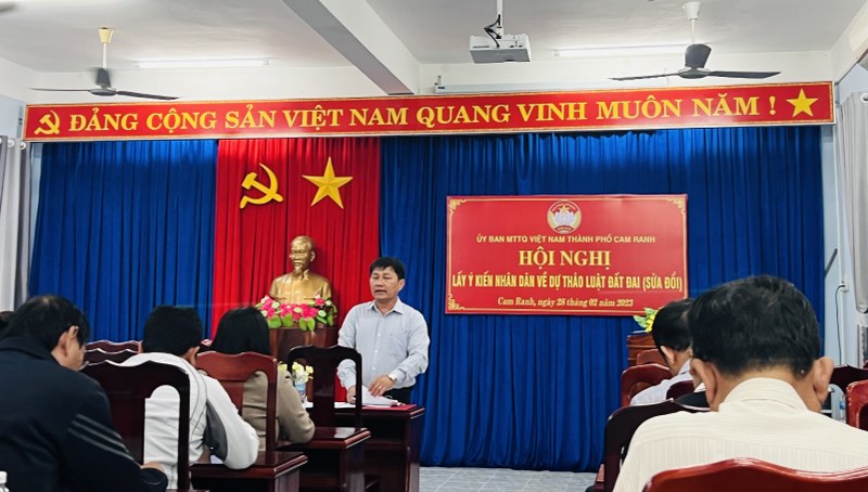 Sáng ngày 28/02/2023, tại Hội trường Ủy ban MTTQ thành phố Cam Ranh đã tổ chức Hội nghị lấy ý kiến Nhân dân về Dự thảo Luật Đất đai (sửa đổi). Tham dự Hội nghị có ông Trần Khánh Hòa - Ủy viên Ban Thường vụ Thành ủy, Trưởng Ban Dân vận, Chủ tịch Ủy ban MTTQ Việt Nam thành phố.