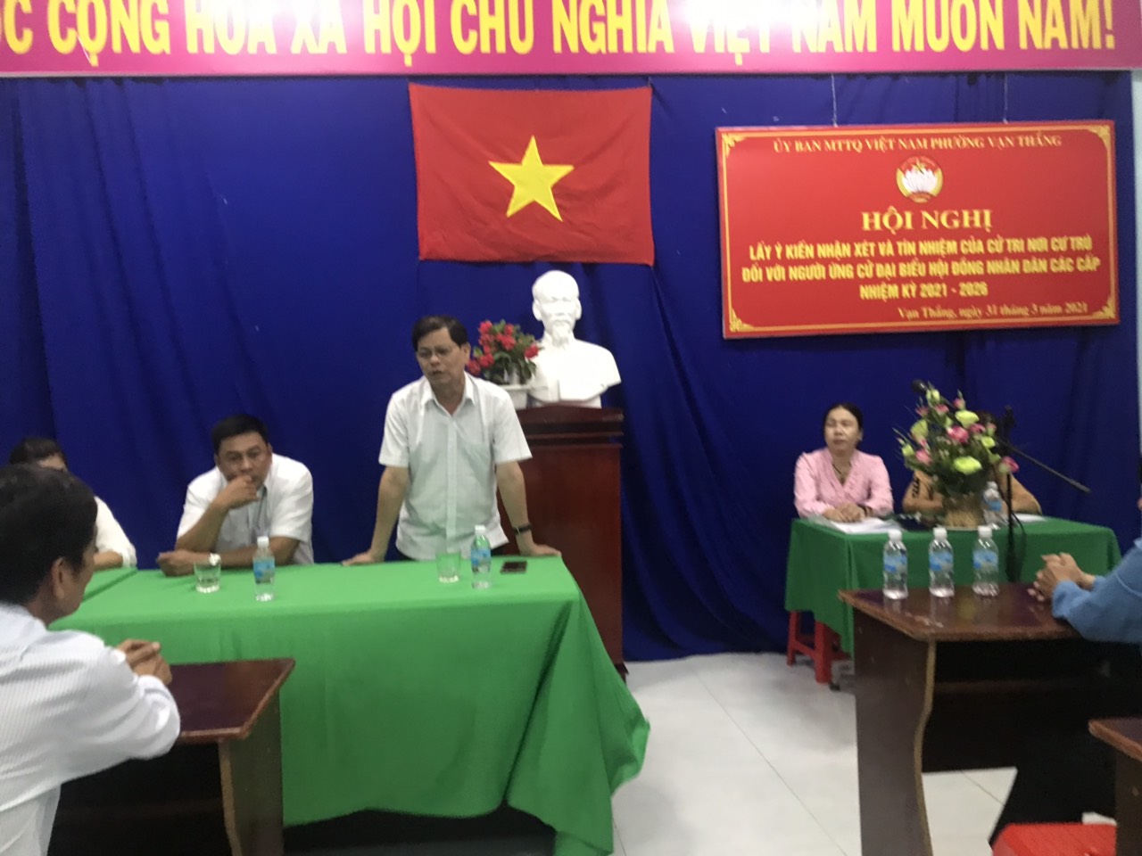Tối ngày 31/3, tại hội trường tổ dân phố 2 Vạn Trung (157/8 đường 2/4), Uỷ ban mặt trận tổ quốc phường Vạn Thắng phối hợp với UBND phường Vạn Thắng tổ chức hội nghị lấy ý kiến nhận xét và tín nhiệm của cử tri nơi cư trú đối với ông Nguyễn Tấn Tuân – Phó Bí thư Tỉnh ủy, Chủ tịch UBND tỉnh Khánh Hòa, người được giới thiệu ứng cử đại biểu HĐND tỉnh nhiệm kỳ 2021 – 2026.