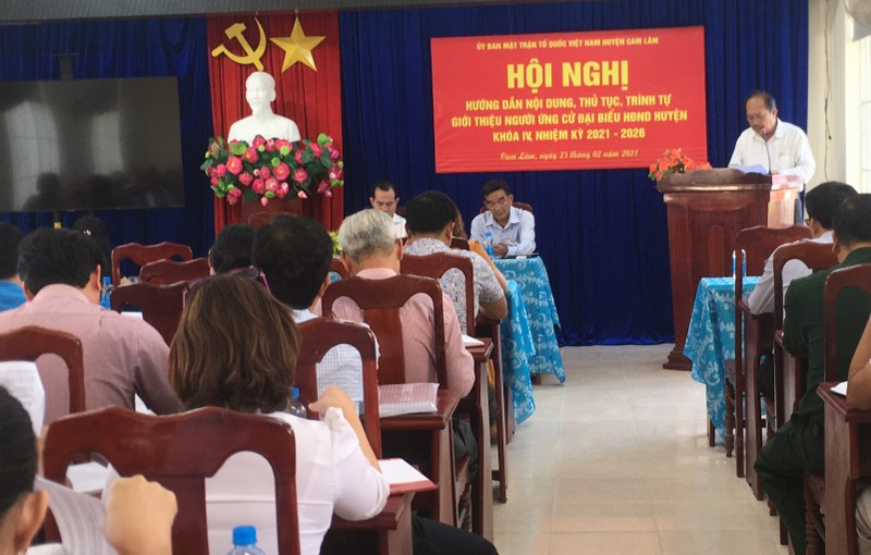 Chiều ngày 25/02/2021, tại hội trường Mặt trận - Đoàn thể huyện, Ban Thường trực Ủy ban MTTQ Việt Nam huyện Cam Lâm tổ chức Hội nghị hướng dẫn nội dung, thủ tục, trình tự, giới thiệu người ứng cử đại biểu HĐND huyện Cam Lâm, khóa IV, nhiệm kỳ 2021 – 2026. Ông Nguyễn Trí Tuân Ủy viên Ban Thường vụ Huyện ủy, Trưởng ban Dân vận Huyện ủy, Chủ tịch Uỷ ban MTTQ Việt Nam huyện chủ trì. Tham dự hội nghị có lãnh đạo HĐND, UBND huyện, các tổ chức, cơ quan, đơn vị được phân bổ đại biểu ứng cử đại biểu HĐND huyện.