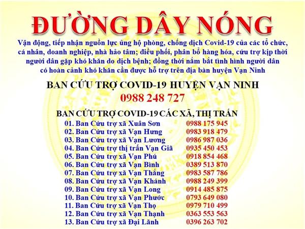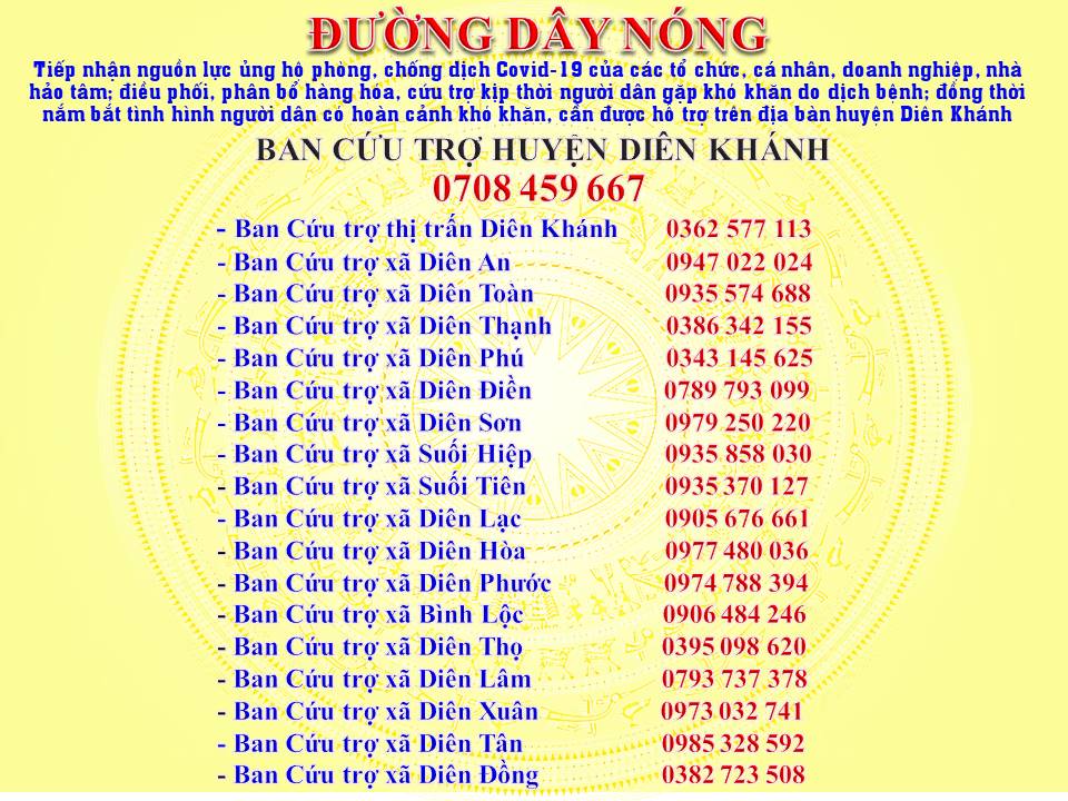 Số điện thoại đường dây nóng của Trung tâm Cứu trợ Covid-19 tỉnh 0868.174.040 hoặc liên hệ đến Ban Cứu trợ Covid-19 các huyện, thị, thành phố, gồm: Nha Trang 0906.439.072; Cam Ranh 0345.845.819; Ninh Hòa 0795.759.955; Vạn Ninh 0988.248.727; Diên Khánh 0918.221.719; Cam Lâm 0972.330.971; Khánh Sơn 0852.224.488; Khánh Vĩnh 0983.865.860.
