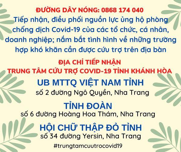 Mọi sự ủng hộ cho Trung tâm Cứu trợ Covid-19 tỉnh gửi về UBMTTQ Việt Nam tỉnh (số 2 đường Ngô Quyền, phường Xương Huân, TP. Nha Trang); Tỉnh đoàn (số 6 đường Hoàng Hoa Thám, TP. Nha Trang) hoặc Hội Chữ thâp đỏ tỉnh (số 34 đường Yersin TP. Nha Trang). Số điện thoại tiếp nhận: 0913.483.009.