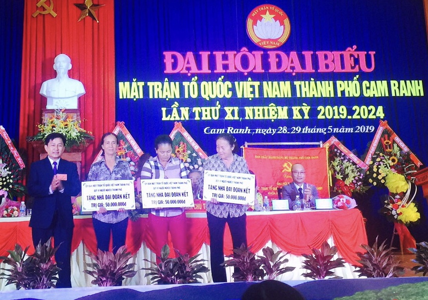 Ông Trần Khánh Hòa - Chủ tịch Ủy ban MTTQ Việt Nam Thành phố Cam Ranh trao tượng trưng nhà đại đoàn kết cho người nghèo