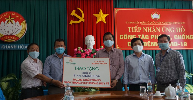 Sáng 22/4/2020, Ủy ban Mặt trận Tổ quốc (MTTQ) Việt Nam tỉnh Khánh Hòa đã tổ chức tiếp nhận hỗ trợ từ các đơn vị ủng hộ cho công tác phòng, chống dịch Covid-19 gồm Công đoàn ngành Văn hóa thể thao (80 triệu đồng) và Tập đoàn Hưng Thịnh (100.000 khẩu trang, 3.000 đồ bảo hộ).