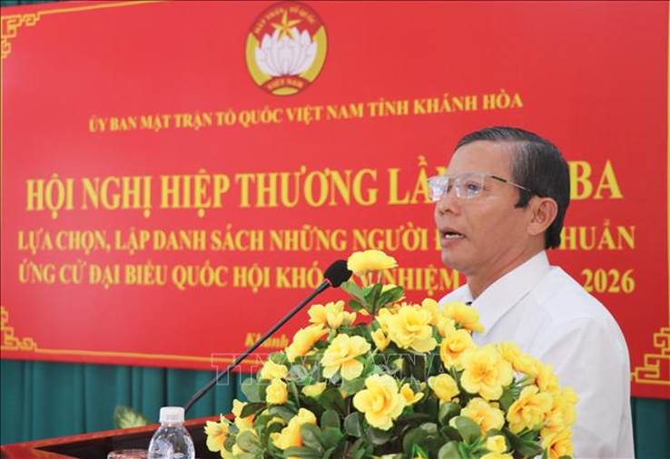 Ngày 16/4, Ban Thường trực Ủy ban MTTQ Việt Nam tỉnh Khánh Hòa tổ chức hội nghị Hiệp thương lần thứ ba để lựa chọn, lập danh sách những người đủ tiêu chuẩn ứng cử đại biểu Quốc hội (ĐBQH) khóa XV và đại biểu HĐND tỉnh , nhiệm kỳ 2021-2026.