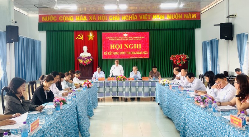 Lãnh đạo Ủy ban MTTQVN tỉnh và lãnh đạo Huyện ủy, HĐND, UBND huyện Vạn Ninh chứng kiến ký kết giao ước thi đua Cụm thi đua Mặt trận các huyện, thị, thành phố năm 2023