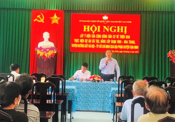 Sáng ngày 10/6, Ban Thường trực Ủy ban MTTQ Việt Nam tỉnh Khánh Hòa phối hợp với Ban Thường trực Ủy ban MTTQ Việt Nam huyện Vạn Ninh tổ chức lấy ý kiến cộng đồng dân cư bị ảnh hưởng bởi dự án cải tạo, nâng cấp đoạn Vinh - Nha Trang, tuyến đường sắt Hà Nội - Tp Hồ Chí Minh. Ông Đặng Ngọc Minh - Uỷ viên BTT, Trưởng Ban Dan chủ - Pháp luật Ủy ban MTTQ Việt Nam tỉnh Khánh Hòa và ông Nguyễn Đức Hoà - Phó chủ tịch Uỷ ban MTTQ huyện Vạn Ninh - đồng chủ trì Hội nghị; thành phần tham gia Hội nghị còn có đại diện lãnh đạo huyện Vạn Ninh; lãnh đạo xã và đại diện các hộ dân xã Vạn Khánh, Vạn Bình, Vạn Thắng và thị trấn Vạn Giã bị ảnh hưởng bởi dự án; đại diện Ban Quản lý dự án đường sắt.