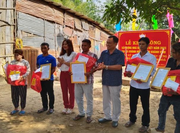 Phát biểu tại Lễ khởi công, đồng chí Huỳnh Thị Phượng - Phó Chủ tịch Ủy ban MTTQ Việt Nam tỉnh khẳng định: Những năm qua, Ủy ban MTTQ Việt Nam tỉnh luôn quan tâm đến công tác bảo đảm an sinh xã hội, giúp đỡ các hộ nghèo bằng việc ban hành các chính sách, chương trình hỗ trợ và vận động các tổ chức, cá nhân ủng hộ, giúp đỡ người nghèo, góp phần cùng với cấp ủy, chính quyền địa phương phấn đấu không còn hộ nghèo trong những năm tới đây. Đặc biệt, chương trình hỗ trợ xây dựng nhà “Đại đoàn kết” của Ủy ban MTTQ Việt Nam tỉnh đã có sức lan toả sâu rộng, thể hiện tinh thần đoàn kết, tương thân, tương ái của dân tộc, được đông đảo các tầng lớp nhân dân, các cơ quan, đơn vị, doanh nghiệp đồng tình hưởng ứng. Riêng trong năm 2023, Ủy ban MTTQ Việt Nam tỉnh đã huy động được 03 tỷ đồng để hỗ trợ xây dựng 50 ngôi nhà đại đoàn kết cho những hộ nghèo có khó khăn về nhà ở trên địa bàn huyện Khánh Vĩnh.