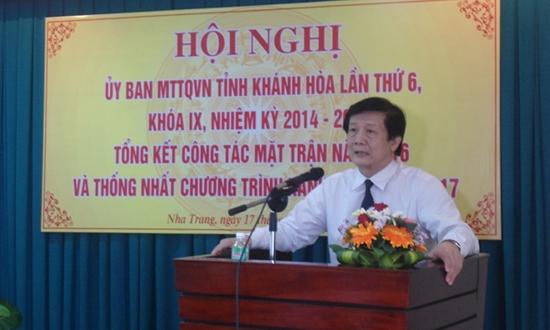 Sáng ngày 17/1, Ủy ban MTTQ Việt Nam tỉnh Khánh Hòa đã tổ chức Hội nghị lần thứ 6, Khóa IX, nhiệm kỳ 2014-2019 tổng kết công tác Mặt trận năm 2016, triển khai chương trình phối hợp và thống nhất hành động năm 2017.
