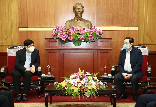 Chủ tịch UBTW MTTQ Việt Nam Trần Thanh Mẫn trao đổi với Thứ trưởng Thường trực Bộ Y tế Nguyễn Thanh Long