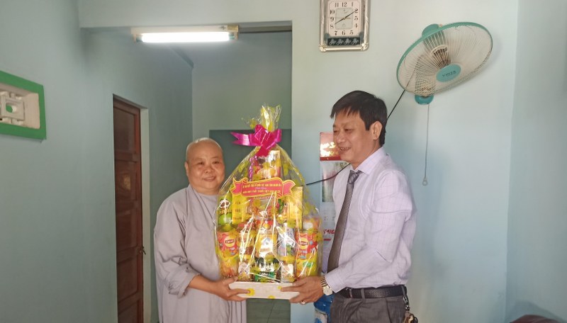 Ông Huỳnh Mộng Giang thăm, tặng quà cho Ni sư Thích Nữ Thông Thái, phụ trách Cơ sở thuốc Nam thuộc Tịnh Thất Hưng Long