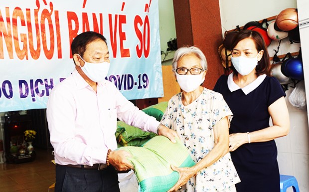 Ông Trương Ngọc Hưng - Ủy viên Thường trực, Trưởng Ban Phong trào Ủy ban MTTQ Việt Nam tỉnh trao hỗ trợ gạo người bán vé số địa bàn TP. Nha Trang