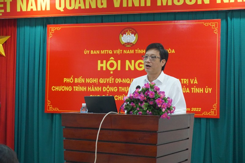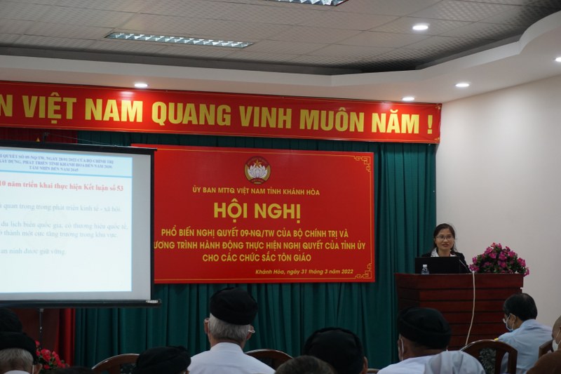 Sáng ngày 31/3, Ủy ban MTTQ Việt Nam tỉnh Khánh Hòa tổ chức Hội nghị phổ biến, tuyên truyền Nghị quyết số 09-NQ/TW ngày 28/01/2022 của Bộ Chính trị về xây dựng, phát triển tỉnh Khánh Hòa đến năm 2030, tầm nhìn đến năm 2045 và thông tin chính sách pháp luật, chương trình phối hợp thực hiện trong năm 2022 cho hơn 150 đại biểu là các vị chức sắc, chức việc, nhà tu hành, người uy tín trong các tôn giáo trên địa bàn tỉnh.